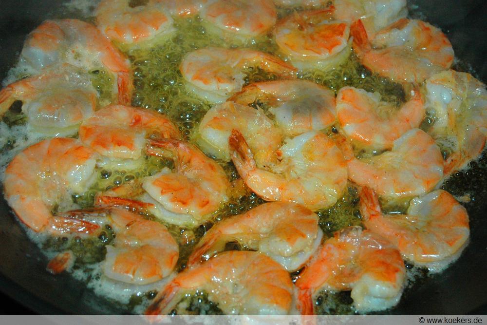 Bandnudeln in tomatiger Sahnesoße mit gebratenen Garnelen